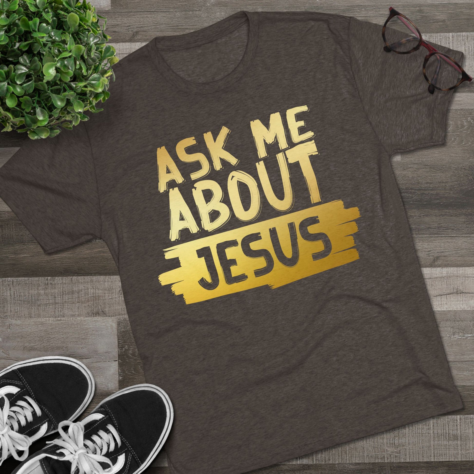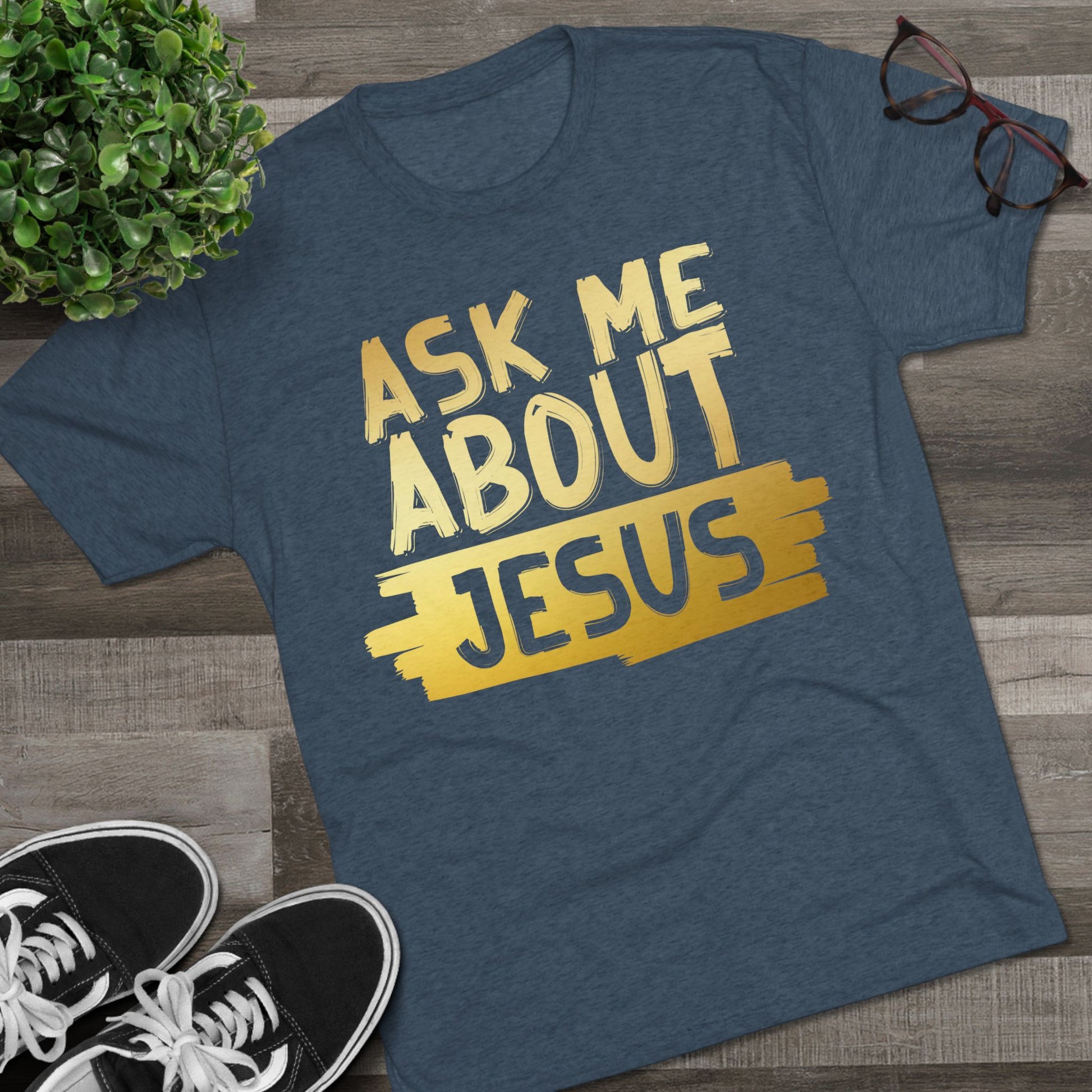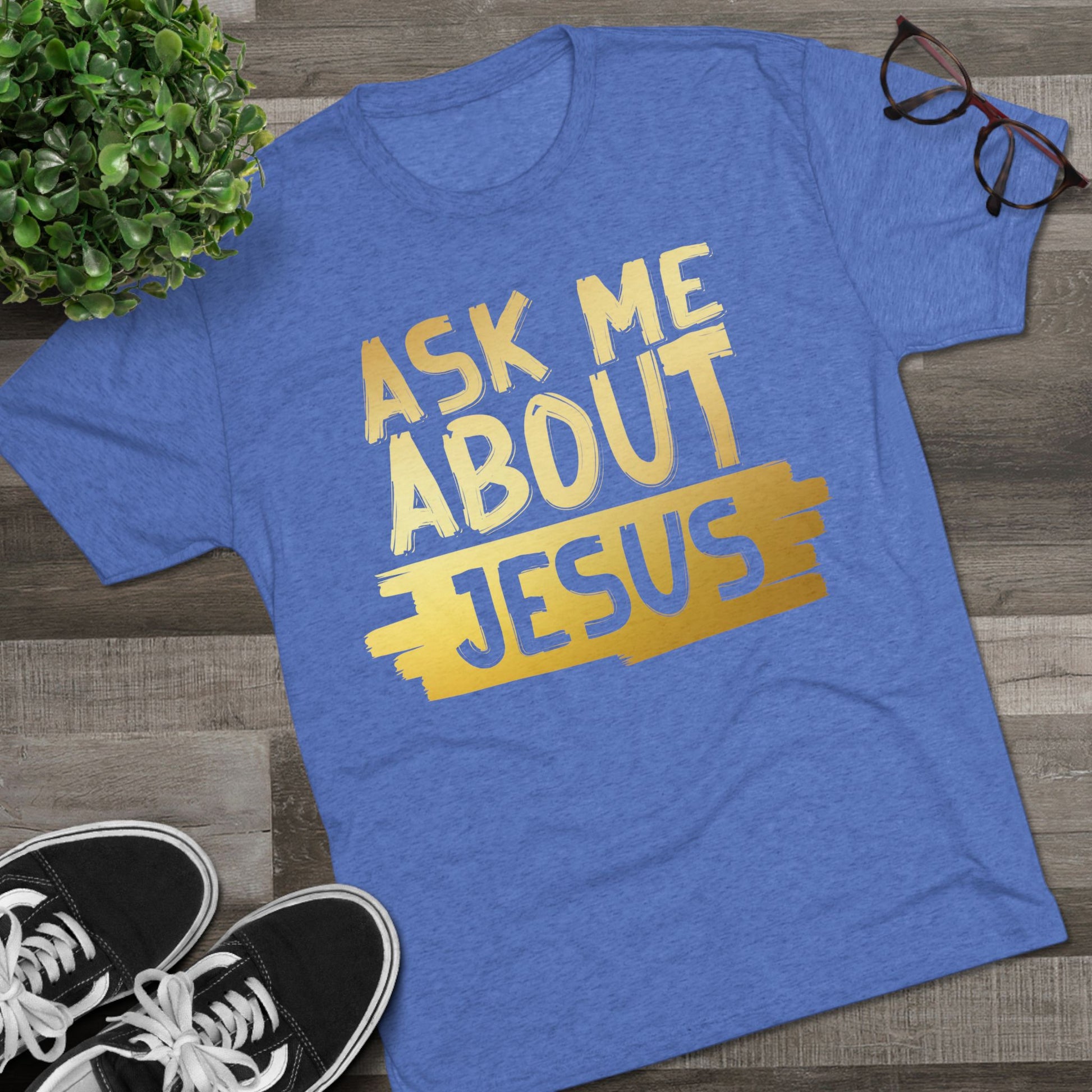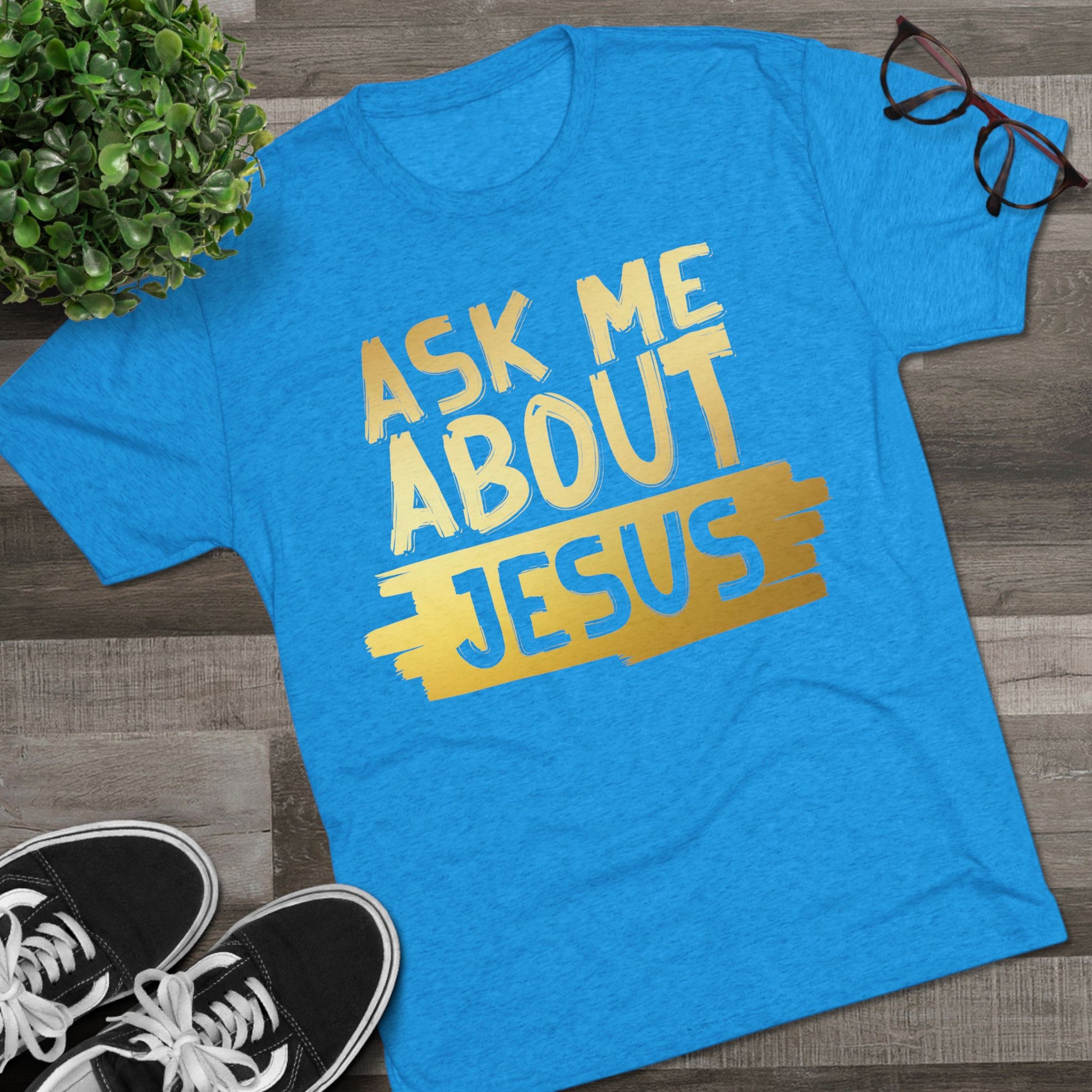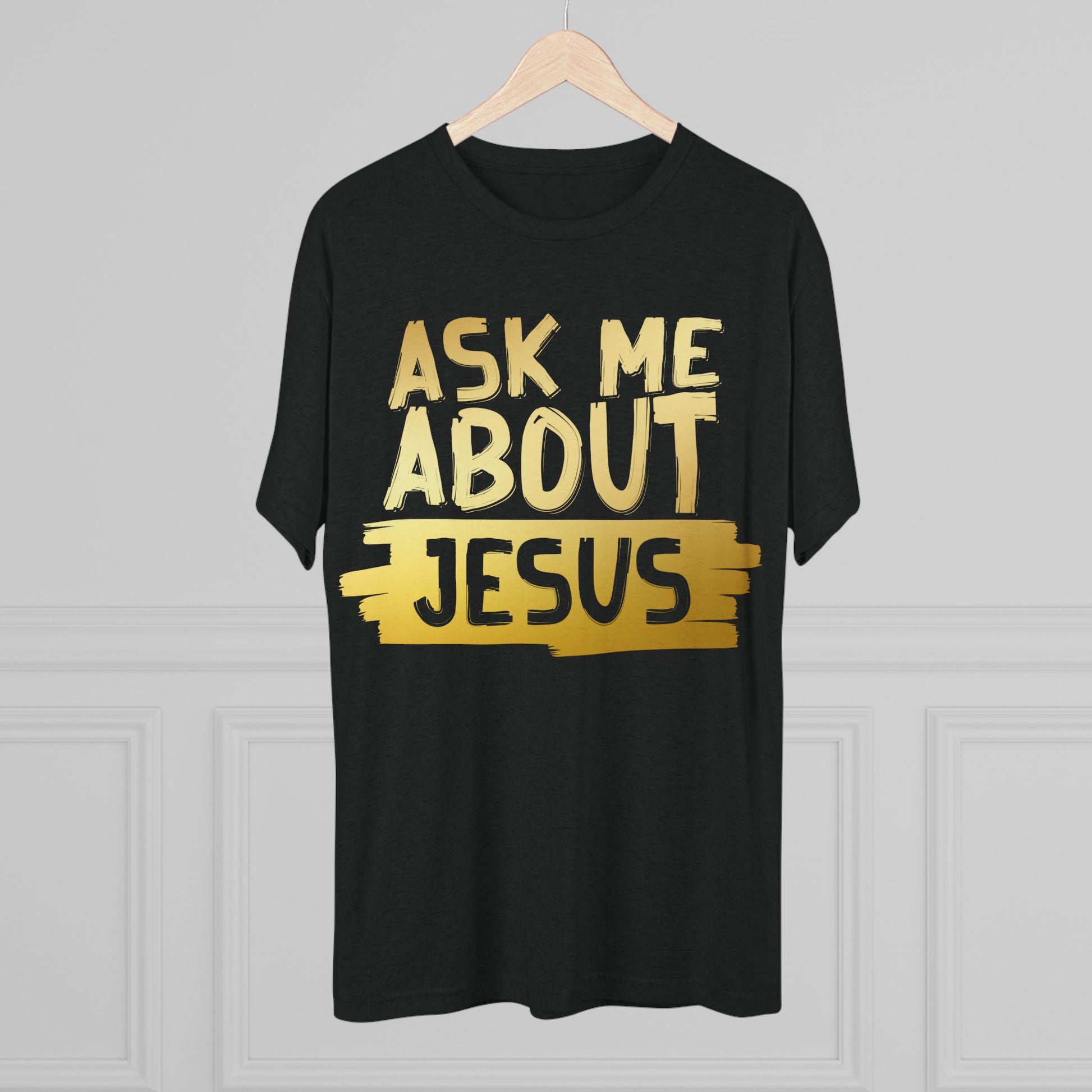Unisex Tri-Blend Crew Tee, Faith-Inspired Gold Tee, Christian T-Shirt, Inspirational Gift, Casual Everyday Wear, Ask Me About Jesus Shirt